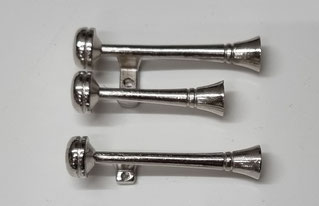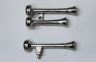 Ich habe die Fanfaren entwickelt, da ich nirgens welche für unsere Modelle gefunden habe. Die Fanfaren sind aus Metall und vernickelt. Die Doppelfanfare wie auch das Einzelhorn sind ca. 40mm lang
